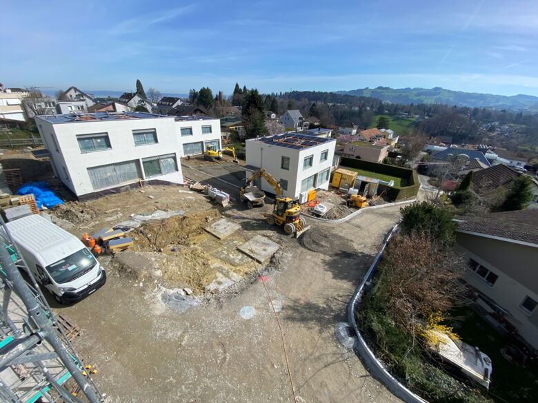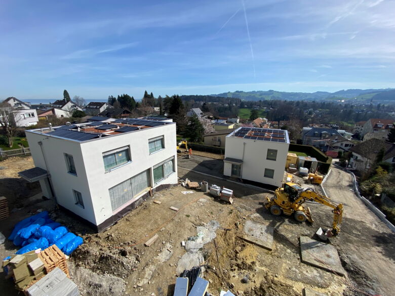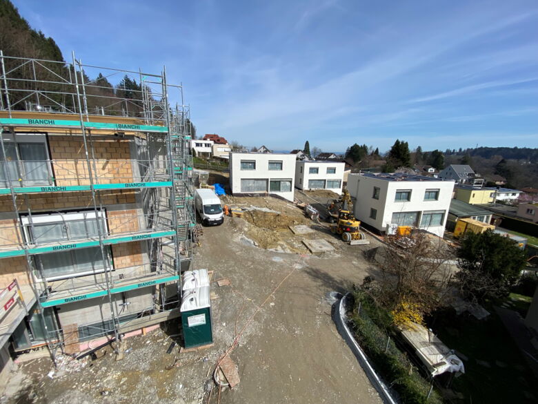 Die Straßen- und Umgebungsarbeiten werden derzeit durchgeführt, während gleichzeitig der Innenausbau der Häuser voranschreitet.